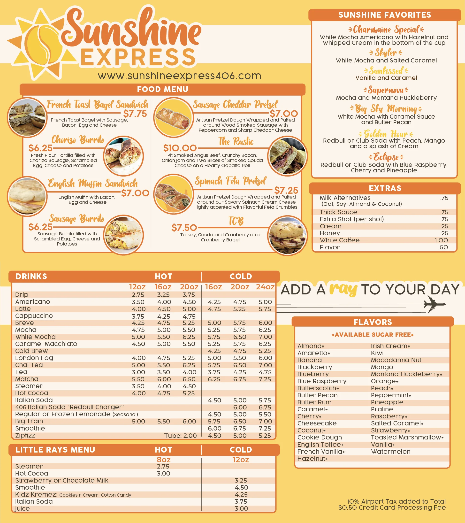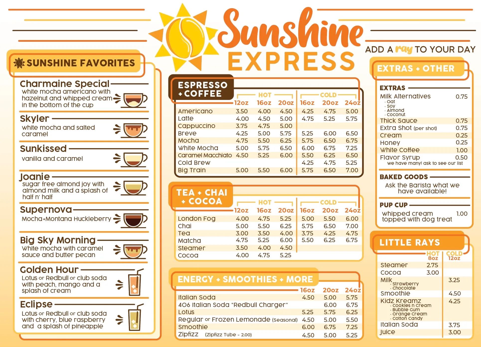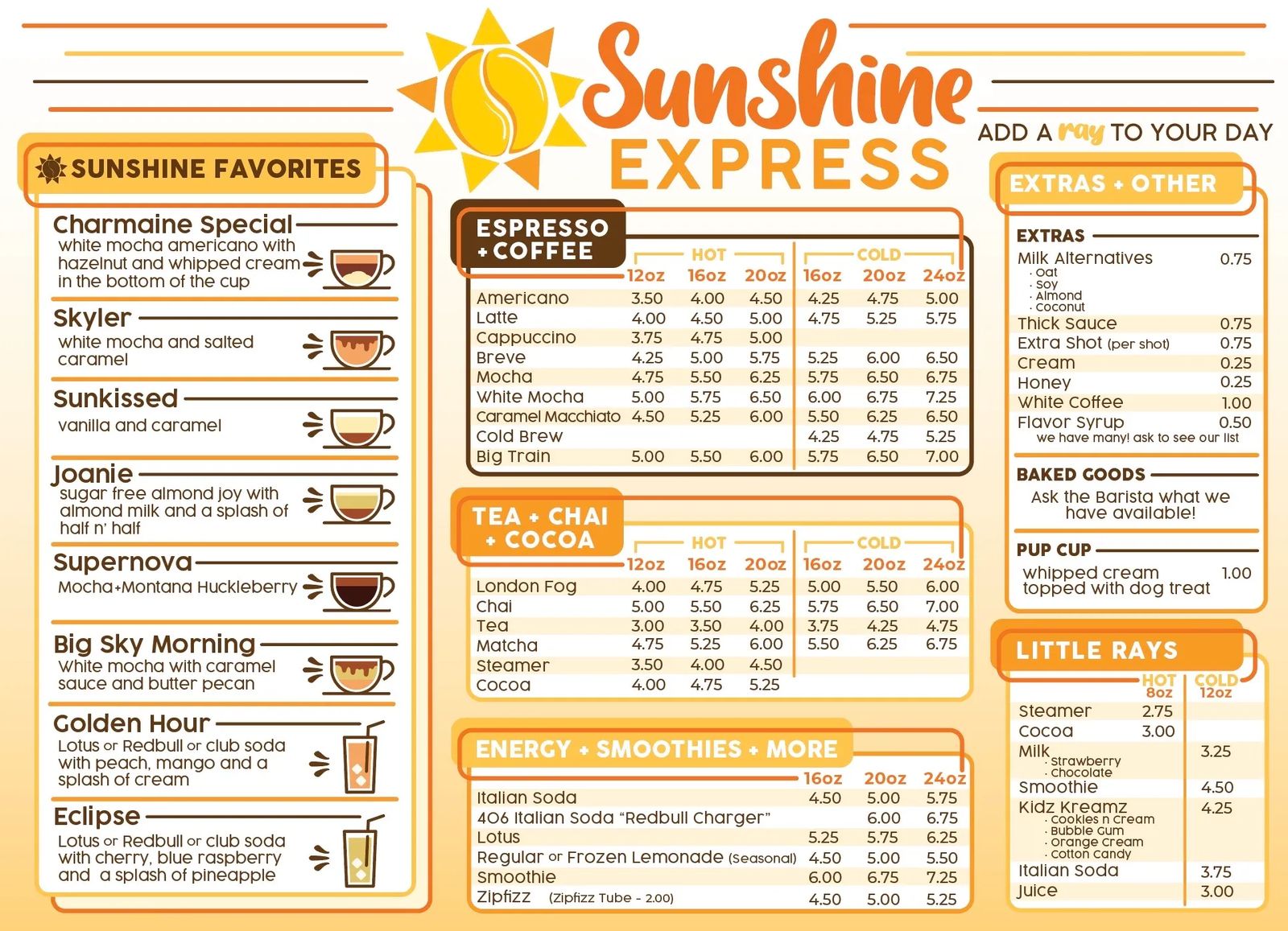 Add a ray to your day! Sunshine Express is a locally owned and operated coffee shop by women. Currently just one location on the west end of Billings, Montana; plus a mobile coffee cart for events. Specialty drinks and service that are sure to brighten your day!